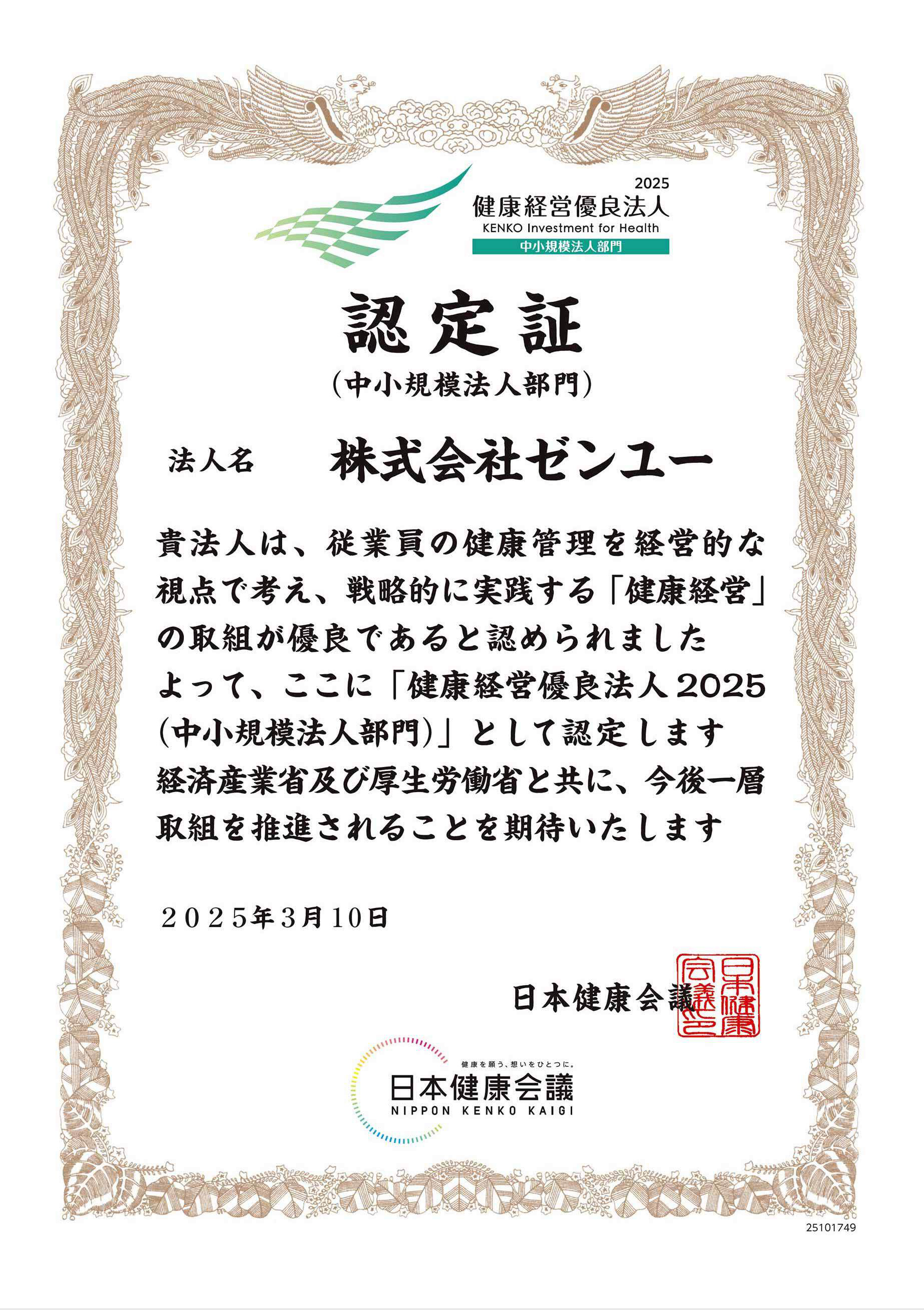 深刻な社会問題となっている少子高齢化。株式会社ゼンユーは、その少子高齢化が急激に加速する日本において、共に働く全従業員の健康寿命延伸と健康増進、企業内コミュニケーションの促進など健全な職場作りに取り組み、2017年には健康宣言を発し、以来毎年、健康経営優良法人として認定証(中小規模法人部門)を授与されています。