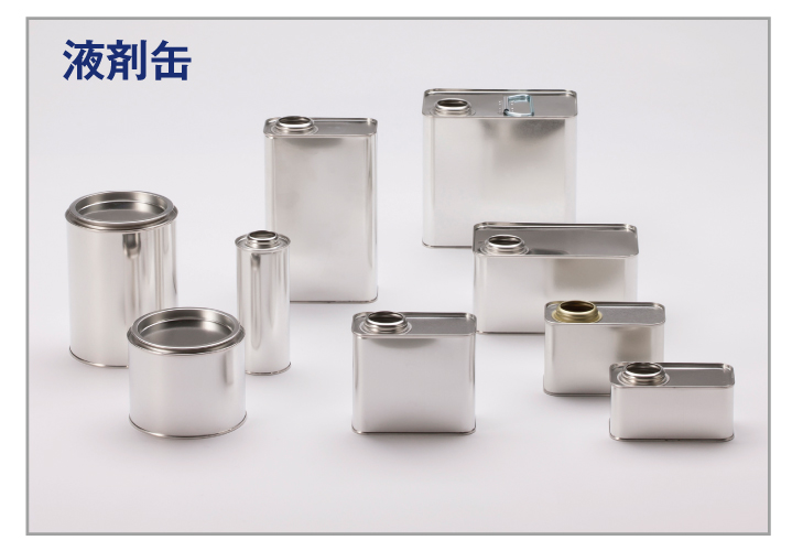 角缶:主に液剤用途として、溶剤などにご使用いただけます。酸素を通さず、遮光できるため、内容物の劣化を防ぎます。漏洩検査を重要課題とし、全数検査や巻締内部の拡大鏡確認など、品質向上に努めています。また、危険物輸送対応として、UN規格を取得。輸出にも対応しています。
