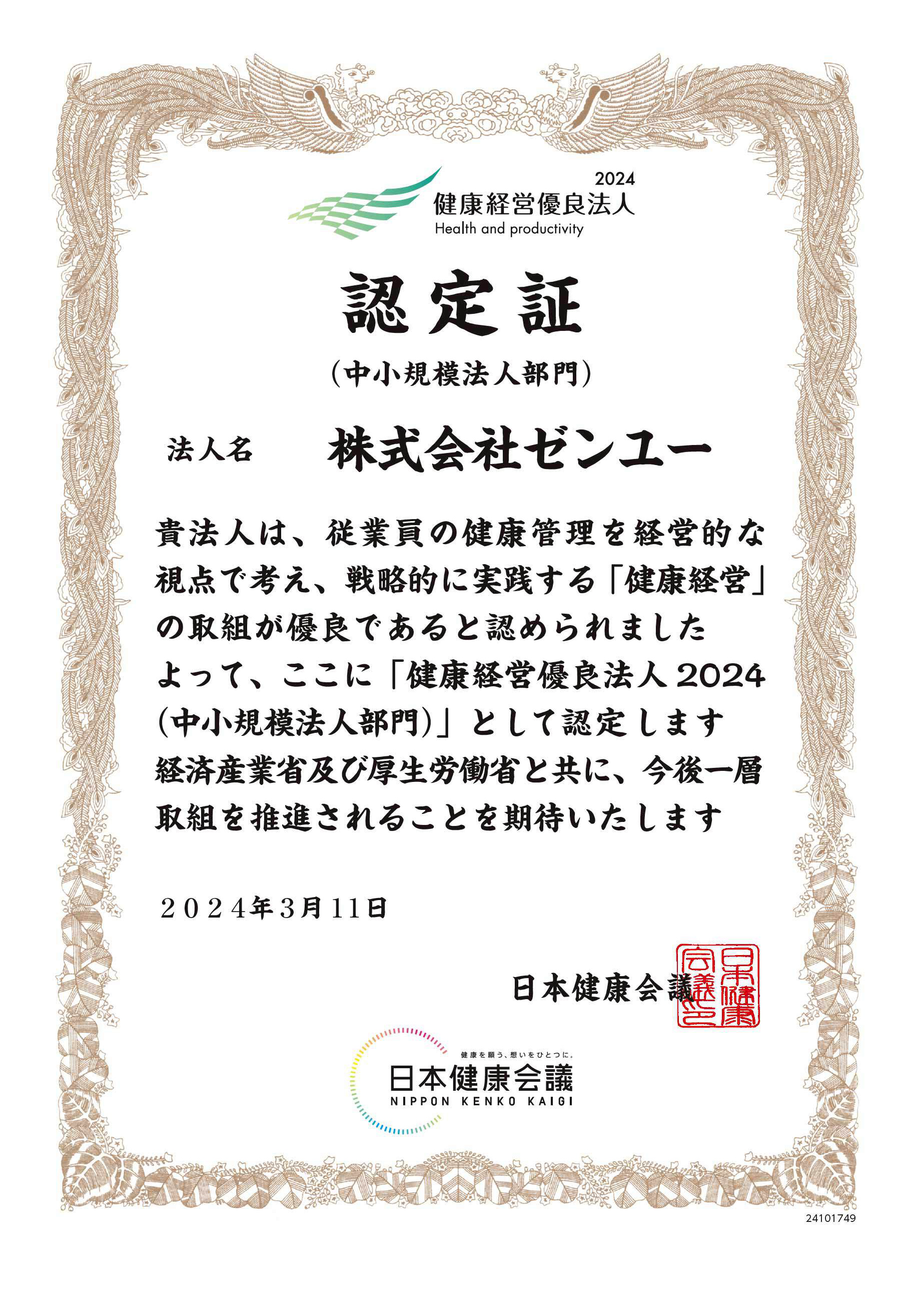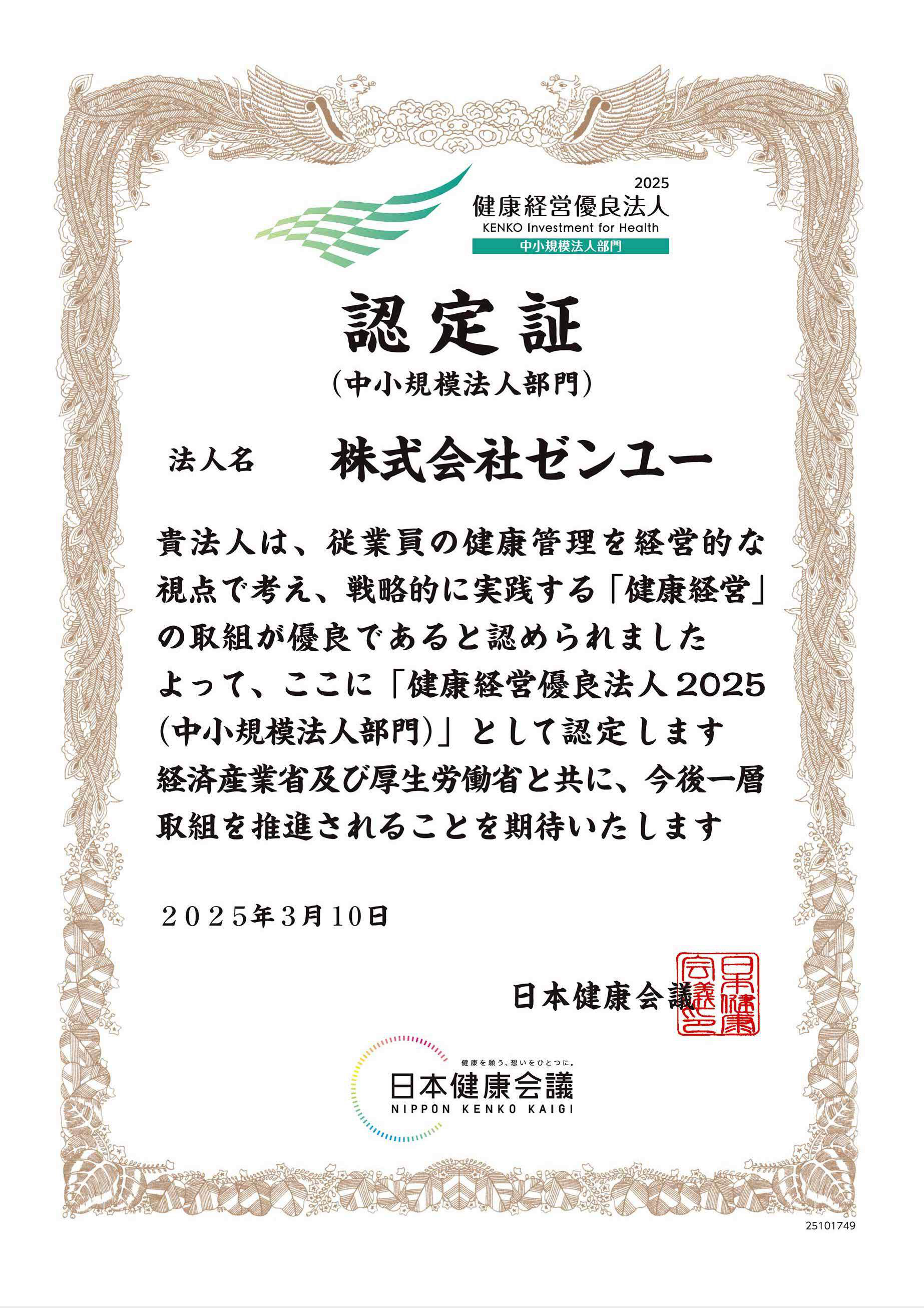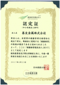 - 2017年1月「健康宣言の証」を協会けんぽ大阪支部様より頂きました。